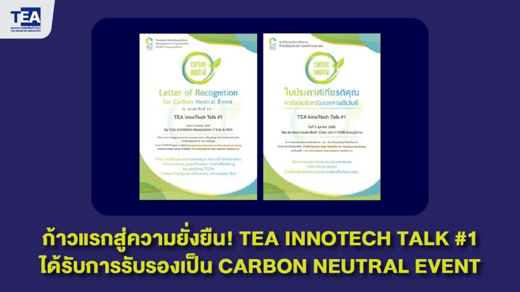 The event “TEA InnoTech Talk #1” organized by the Thai Exhibition Association (TEA) on October 3, 2025, at Jupiter Room 4, IMPACT Exhibition and Convention Center, has been officially certified as a Carbon Neutral Event.
