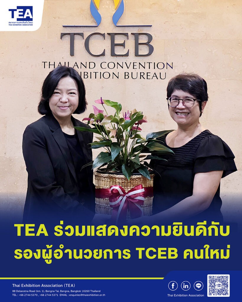 The Thai Exhibition Association (TEA) extends its sincere congratulations to Dr. Jaruwan Suwannasat on the occasion of her appointment as Senior Vice President of the Thailand Convention and Exhibition Bureau (TCEB).